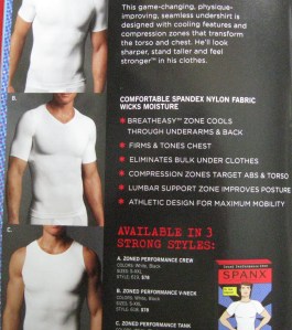 And by the way, we’ve got equal opportunity body image insecurity exploitation here. Note the language: “zoned performance” crew, available in three STRONG styles. A little heavy-handed there, eh?